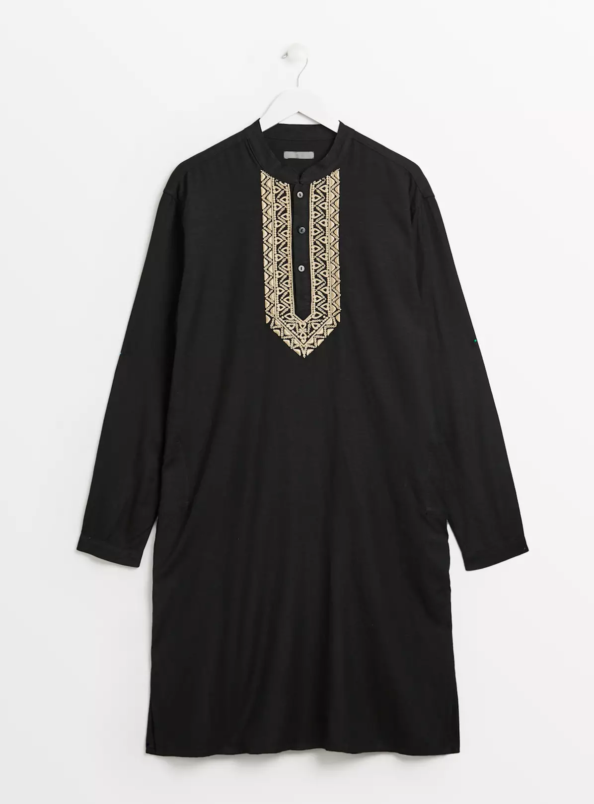 Ideal for both casual and formal occasions, our black kurta is adorned with tonal embroidery around the neck and collar. Crafted with linen, it’s a comfortable option for Eid and other events.