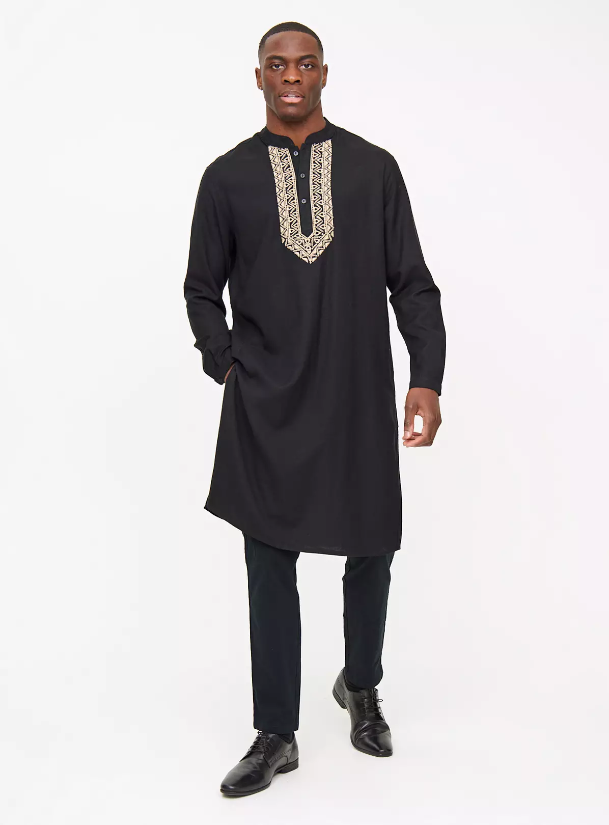 Ideal for both casual and formal occasions, our black kurta is adorned with tonal embroidery around the neck and collar. Crafted with linen, it’s a comfortable option for Eid and other events.