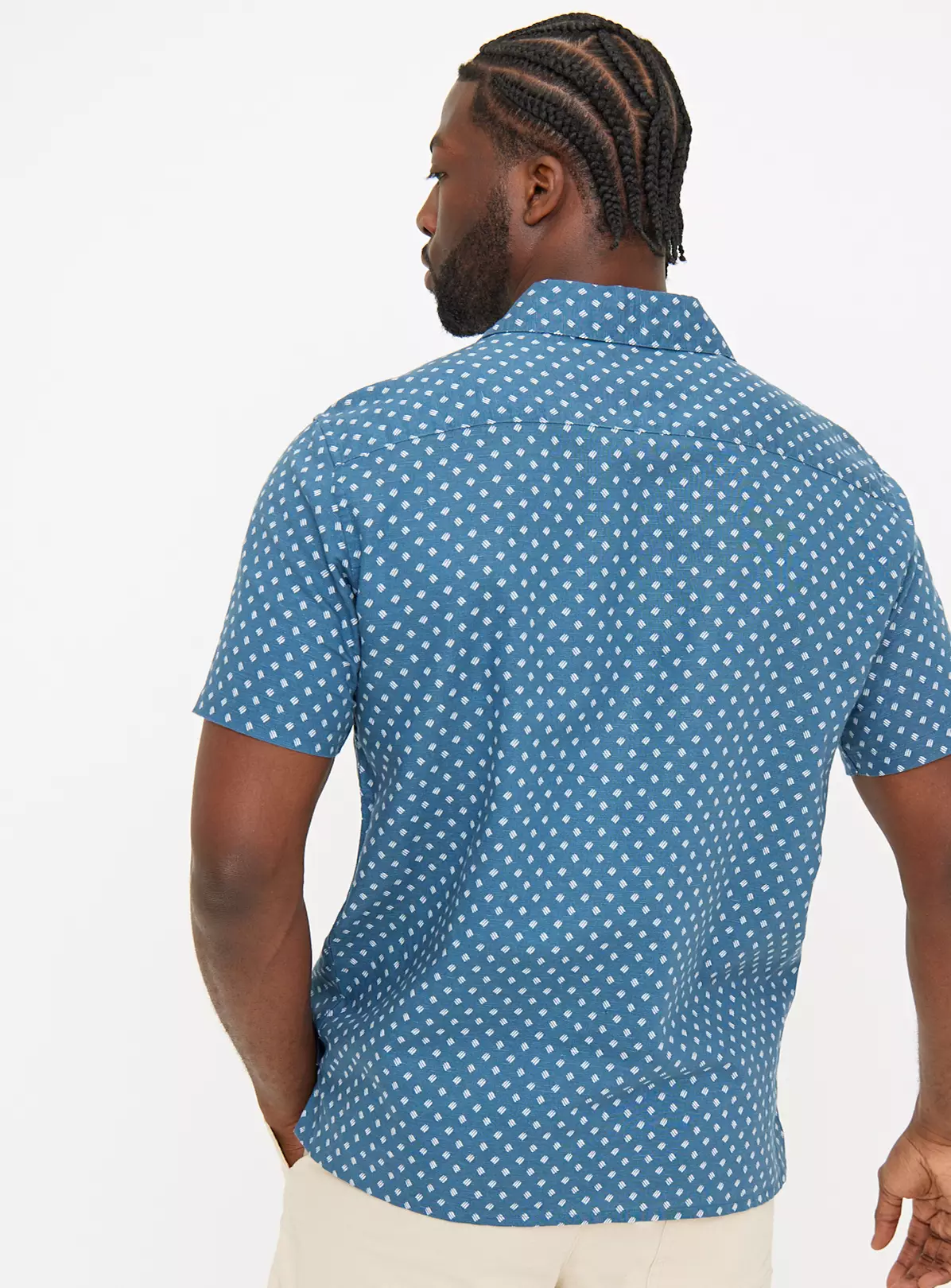 For a classic look this summer reach for our blue linen blend shirt. In a dash print, it has short sleeves and features value fastening. Style it with denim shorts for a staple weekend outfit.