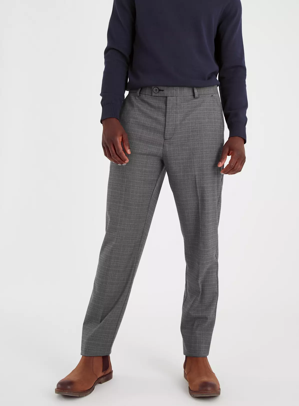 Elevate your smart wear with our grey check tailored trousers. With practical side pockets, belt loops and a zip and value fly, they’re perfect when you need to up your game.
