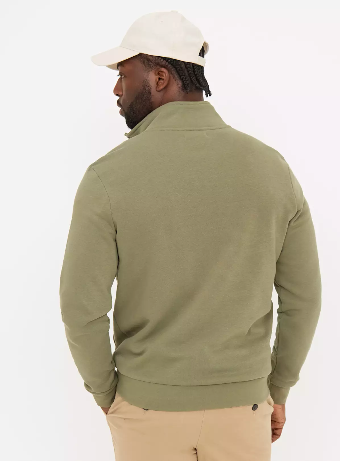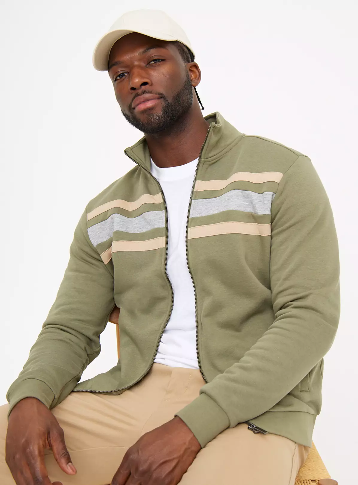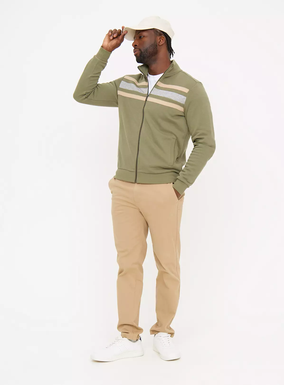 Add a sporty touch to your looks this season with our khaki zip-through sweatshirt. Featuring a colour block stripe on the front, it has a high neckline for a comfy fit. Style it with a pair of chino trousers for a staple spring outfit.