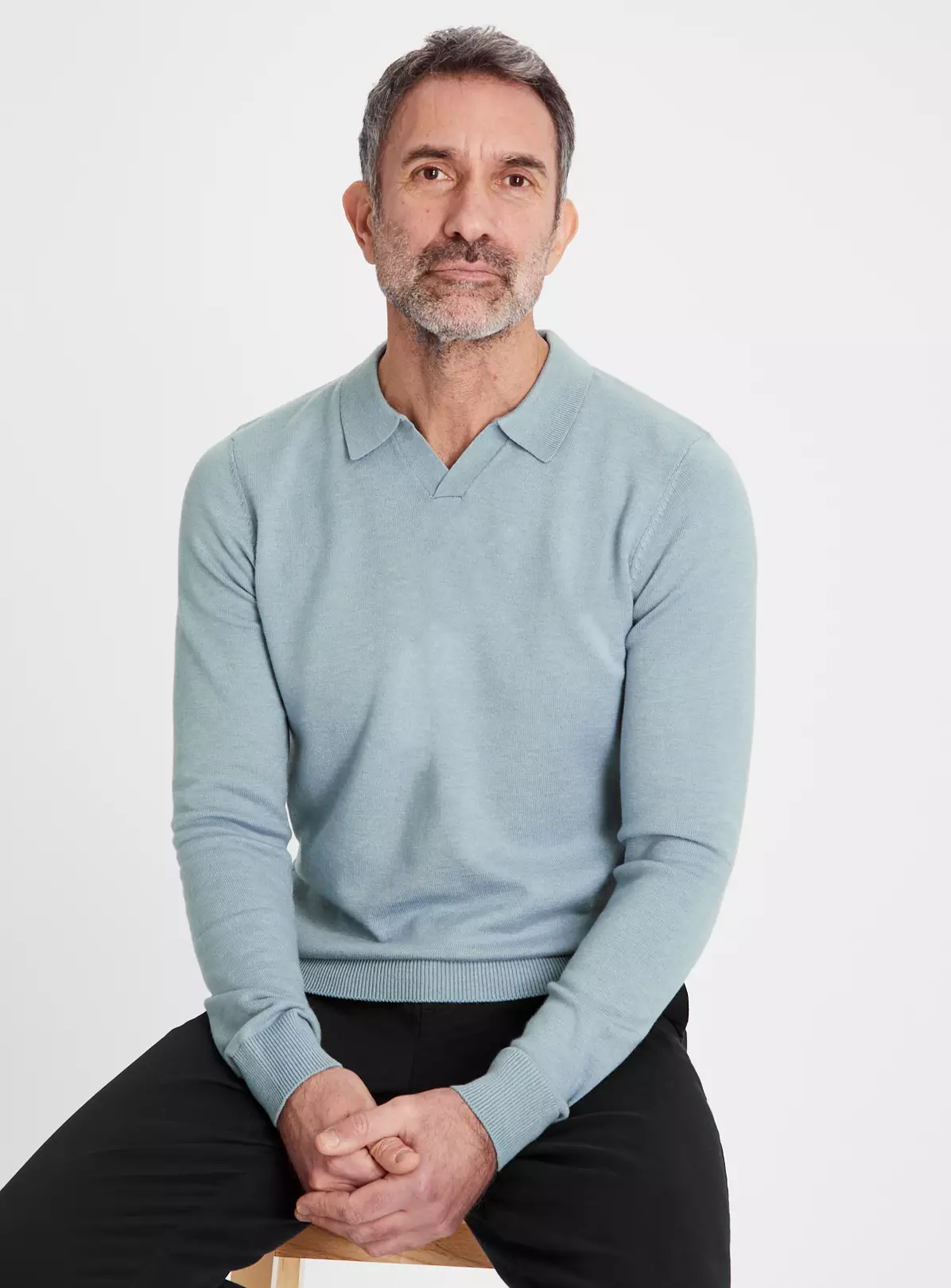 Our polo jumper is an essential for your spring wardrobe. It features a trophy neck and comes in a staple shade of light blue. In a soft touch fabric, it combines comfort with effortless modern style.